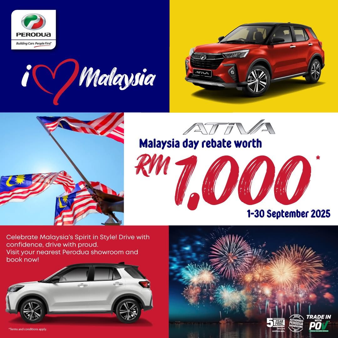 Anda sedang mencari SUV kompak terbaik di Malaysia tahun 2025? Sempena sambutan Hari Kemerdekaan dan Hari Malaysia, kini anda berpeluang memiliki Perodua Ativa dengan promosi istimewa dan rebat menarik sebanyak RM1,000.00